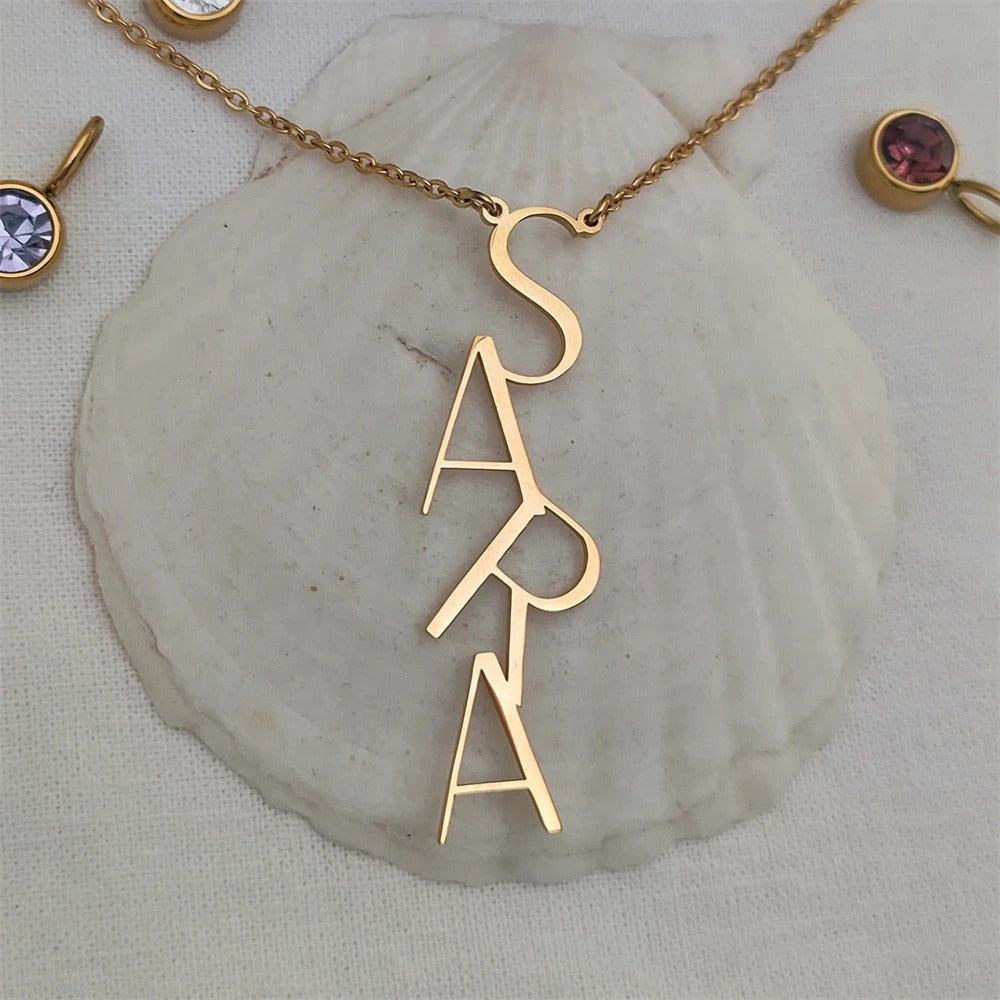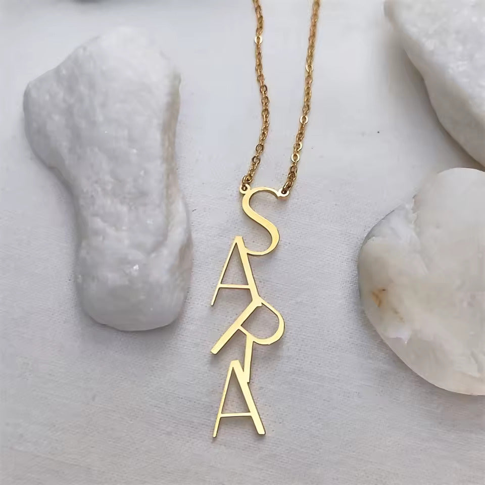 Gi smykkesamlingen din et personlig preg med vårt elegante vertikale navnesmykke. Halskjedet er designet med rene linjer og et minimalistisk uttrykk, perfekt til både hverdags og fest. Smykket kan tilpasses med ditt navn eller initialer, og blir dermed en unik gave til deg selv eller en du er glad i.